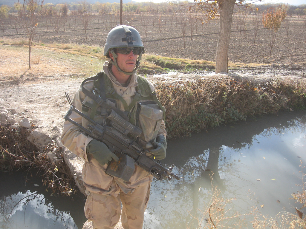 “Na een korte nachtrust en een korte bevelsuitgifte vertrokken we ‘s ochtends vroeg. De eerste keer de poort uit het is nieuw maar toch ook iets van eindelijk. De spanning waar sommige het over hebben van wanneer ze voor het eerst de poort uitgaan heb ik niet gevoeld. Vond het alleen maar leuk en laat het lekker op me afkomen. Op de route naar Chora zat ik in de YPR en zo af en toe in Tarin Kowt moesten we uitstijgen omdat er door Golf (Genie) gesearched werd voor IED’s (Improvised Explosive Devices). Na uiteindelijk klaar te zijn met searchen konden we weer in de voertuigen stappen, we reden uit Tarin Kowt door de woestijn wat meer weg heeft van een maanlandschap dan dat losse zand. Na een stuk de woestijn in te zijn gereden maakten we een 360 (een rondom van voertuigen met de waarneming naar buiten gericht, ieder zijn sector heeft en zo een veilige zone creëert ). Na 20 minuten gerust te hebben gingen we weer verder. Na uiteindelijk aangekomen te zijn in Chora richtten we nog een 360 in voordat we eindelijk het oord in rijden (Greenzone ook wel genoemd ) vanuit de 360 zagen we de White Compound (WHCO, zo genoemd omdat het een groot, ommuurd wit huis is -GvO-) al liggen. Onze nieuwe stek voor de komende 10 dagen. Na aangekomen te zijn op de WHCO kregen we een korte rondleiding over het kamp en wat alles was en hoe het hier in ze werk ging.”