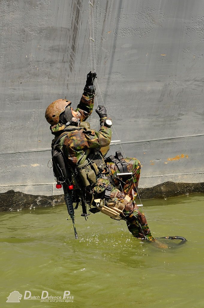 In de laatste week stond het beoefenen van CT procedures tijdens ‘Optreden in Waterrijke Gebieden’ (CT-OWG) centraal. Het zogenoemde ‘boarden’ (enteren) van schepen maakt daar een belangrijk en tegelijkertijd spectaculair onderdeel van uit. Daarom begon de week in het zwembad van de Nederlandse Defensie Academie (NLDA) in Breda. Daar kregen de operators ‘hoe te handelen indien je te water raakt met al je uitrusting om’Â procedures aangeleerd. Deze training is noodzakelijke aangezien het risico om onverwachts overboord te vallen of te springen, tijdens bijvoorbeeld het ‘boarden’ of noodevacuatie, altijd aanwezig is. Daaropvolgend diende het Rotterdamse Waalhavengebied als strijdtoneel voor de CT-assaulters in spé. De Marcor Bulk, een reusachtig bulkcarrier, speelde daarin een belangrijke rol. “Hierop zijn we eerst begonnen met een uitleg over de specifieke uiterlijke- én vooral innerlijke kenmerken van een schip,” verteld SMI Hans. “Het spectaculair uitziende boarden van een schip is namelijk alleen maar het toegang verschaffen tot een schip, terwijl het belangrijkste van de actie dan nog moet komen. Het draait uiteindelijk allemaal om het beëindigen van een gijzelsituatie. Daarvoor is het belangrijk om ‘Close Quarter Battle’, in het kort CQB, procedures op en binnenin het schip te beoefenen. Alle mogelijke varianten zijn daarbij om de hoek komen kijken. Zowel bij dag als bij nacht. Dit kan stil en heimelijk als ook dynamisch en snel zijn. Het mooie aan deze locatie is dat je het CT werk op een schip goed kunt trainen. Met nauwe gangen met veel hoeken, kruisingen en afslagen en met heel veel trappen die afgedekt dienen te worden.”