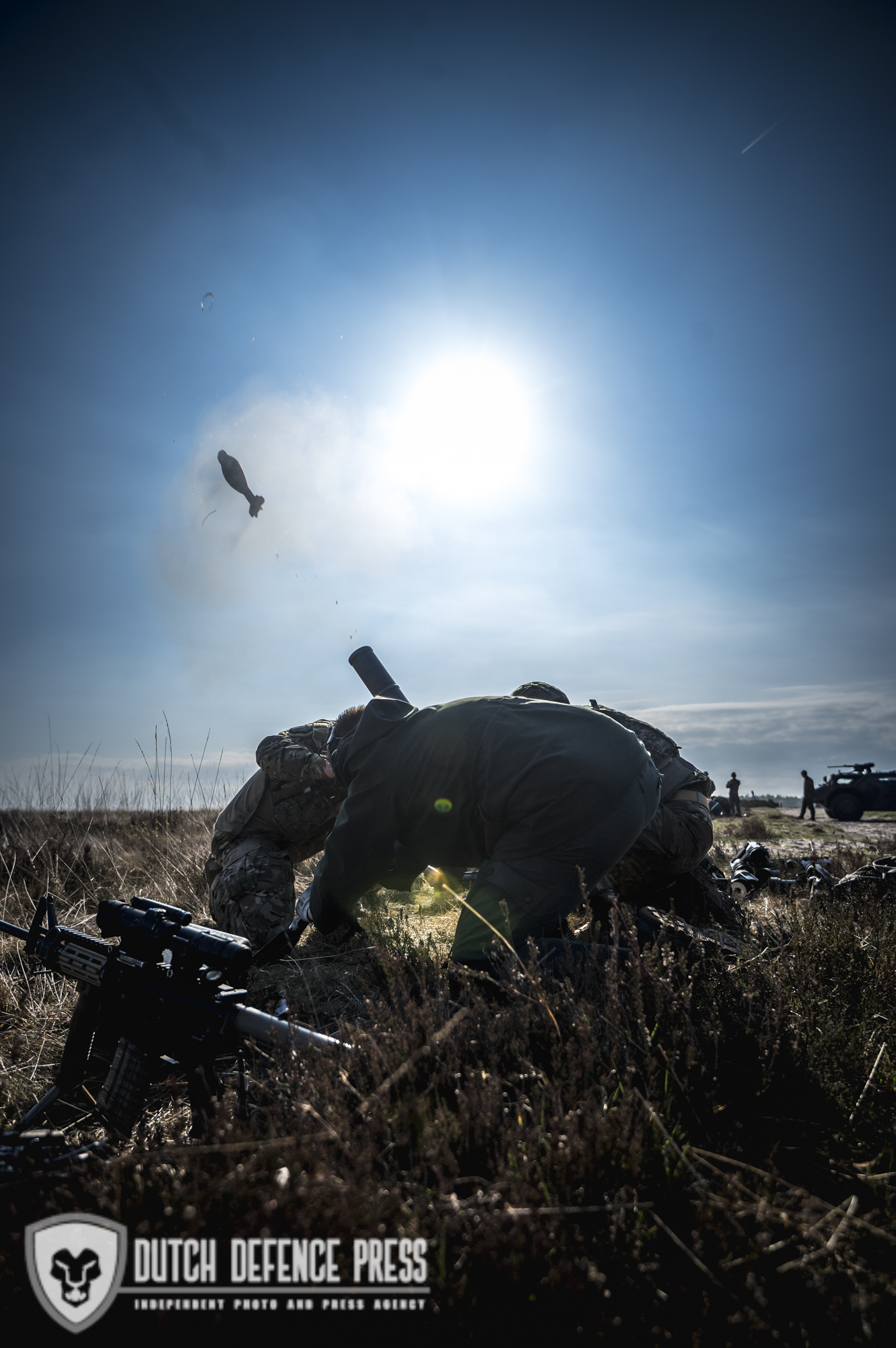 De harde dreunen van de 81millimeter mortieren worden even later gevolgd door nog doffere knallen als de mortiergranaten in het voorterrein neerkomen. In deze oefening wordt met echte munitie geschoten. Zo is het effect op het doel ook vanaf de vuurpositie meteen zichtbaar. In een paar uur tijd worden er diverse missies geschoten door de bemanning van de twee mortieren. Dat gebeurd onder leiding van de vuur-regelaars in opleiding. Deze mannen werden door de instructeurs stevig aan de tand gevoeld met uitdagende opdrachten. De kerels van de Mortiergroep D/42BLJ hebben ondertussen ook zelf weer prima kunnen oefenen.