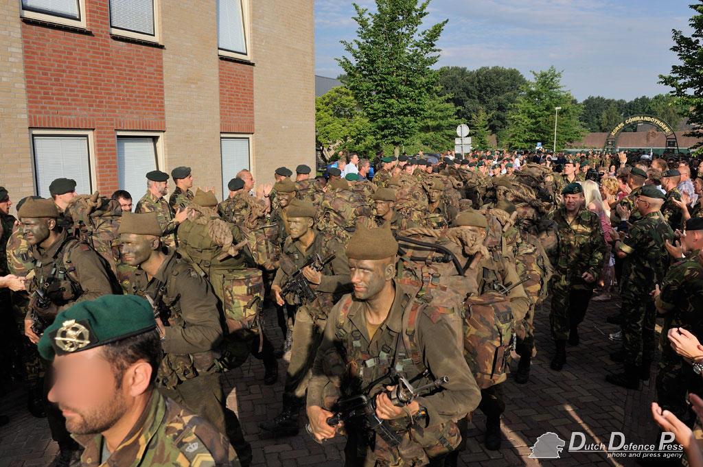 The last week of the course is called the “afmatting” or exhaustion in English. In five days they will travel more than 285 kilometres, mostly on foot. They will do this alone, in buddy pairs, small groups or as a platoon. They are not allowed to have any contact with anyone except their instructors. They will have to show they master the map and compass among other skills they must posses. During the last night of the “afmatting” the will march behind the course commander for the 25 kilometres commanders march. The end is the ‘Gate of Tears’ at the Commando Regiment’s barracks in Roosendaal. Here the survivors are welcomed by family, friends and everyone from the Regiment present.