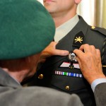 Tijdens een korte ceremonie kregen de drie kersverse dispatchers hun instructeurswing opgespeld door oud-commando en luitenant-kolonel b.d. Pol van Oijen. Deze Indië-, Korea- en Nieuw-Guinea veteraan is een van de eerste Nederlanders die ooit zelf de felbegeerde ‘halve kip’ opgespeld heeft gekregen. Hij is ook een van de weinige die vier operationele inzetsprongen, of te wel combat jumps, in zijn logboek heeft mogen laten aantekenen. In zijn veertig jaar (1946-1986) durende diensttijd is daarnaast ontzettend veel gebeurd. Als auteur van meerdere boeken doemt dan ook een hele rits personen op die hij heeft gekend, vanaf de Stormschool Bloemendaal, via Nederlands-Indië, NDVN in Korea, Nieuw-Guinea tot en met de vele oefeningen bij het KCT. In al zijn boeken blijkt dat hij een scherp oog heeft voor schijnbaar kleine details, dat hij lol in het leven heeft en dat er zelfs op de allerbelabberdste momenten altijd een moment is waarop lachen overheerst. Verhalen en anekdotes dus te over. Dat hij de lachers vlot op zijn hand kan krijgen bewijst hij tijdens zijn korte toespraak met een anekdote, waarbij hij zijn laatste boek ‘Gisteren is voorbij… Een terugblik’ aan de nieuw door hem gebrevetteerde dispatchers uitreikt.